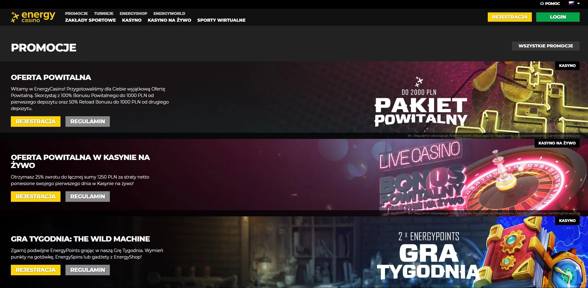 • Oferta powitalna – w Energy Casino bonus ten podzielony jest na 2 części. W ramach pierwszej wpłaty otrzymujemy 100% bonus do kwoty 1000 PLN. Druga wpłata to 50% reload bonus do 1000 PLN.