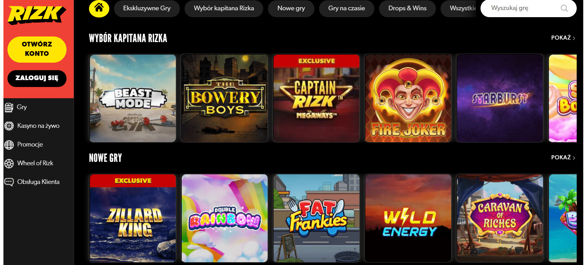 • Wybór kapitana Rizka – czyli polecane przez kasyno tytuły, jak na przykład The Bowery Boys lub Starburst.